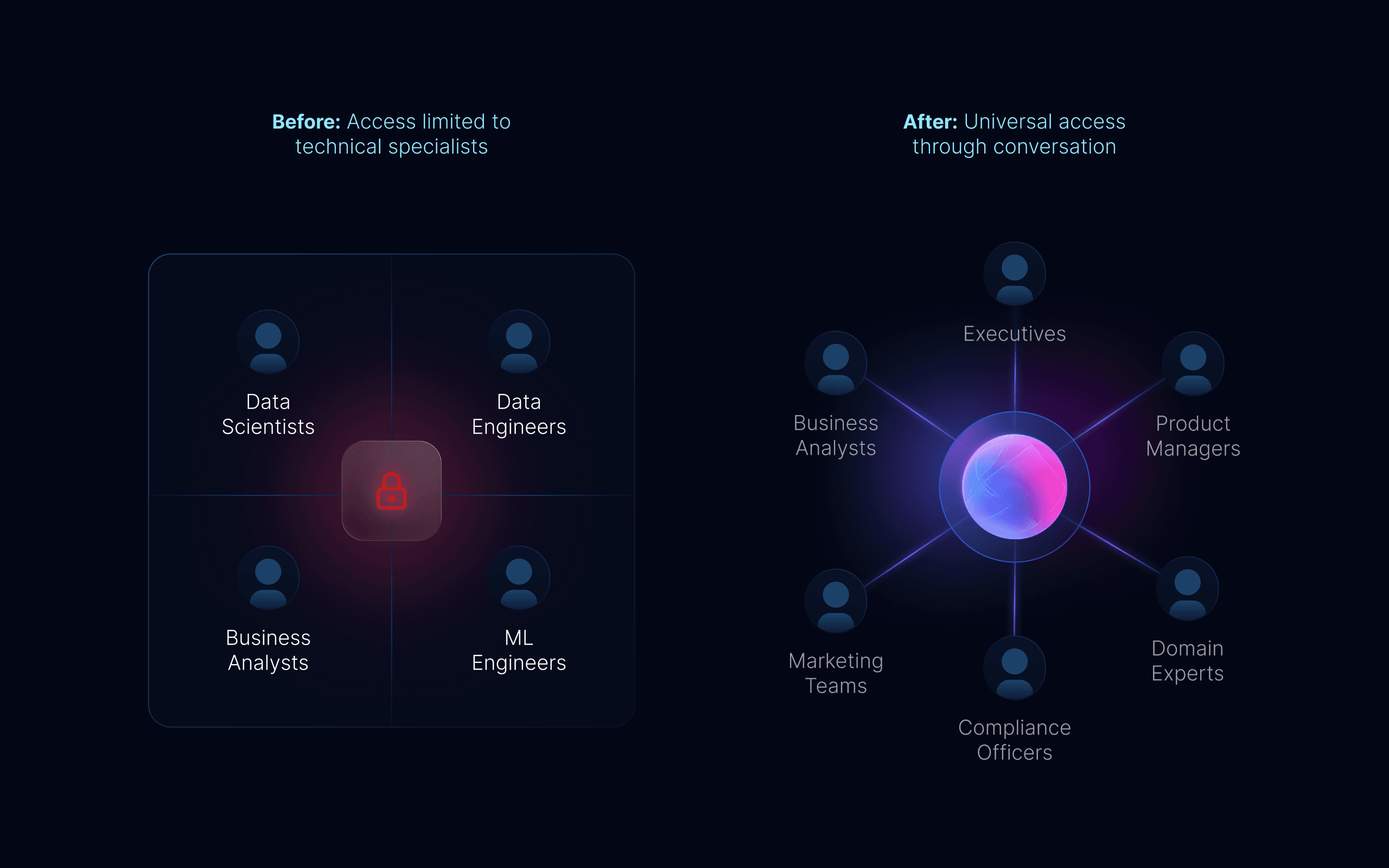 This created a paradox: we could unlock sensitive data through privacy-safe synthetic generation, but only technical specialists could use it. Business analysts, product managers, and domain experts–the people who often understood the data's context best–were locked out, preventing the very democratization the platform was designed to enable.