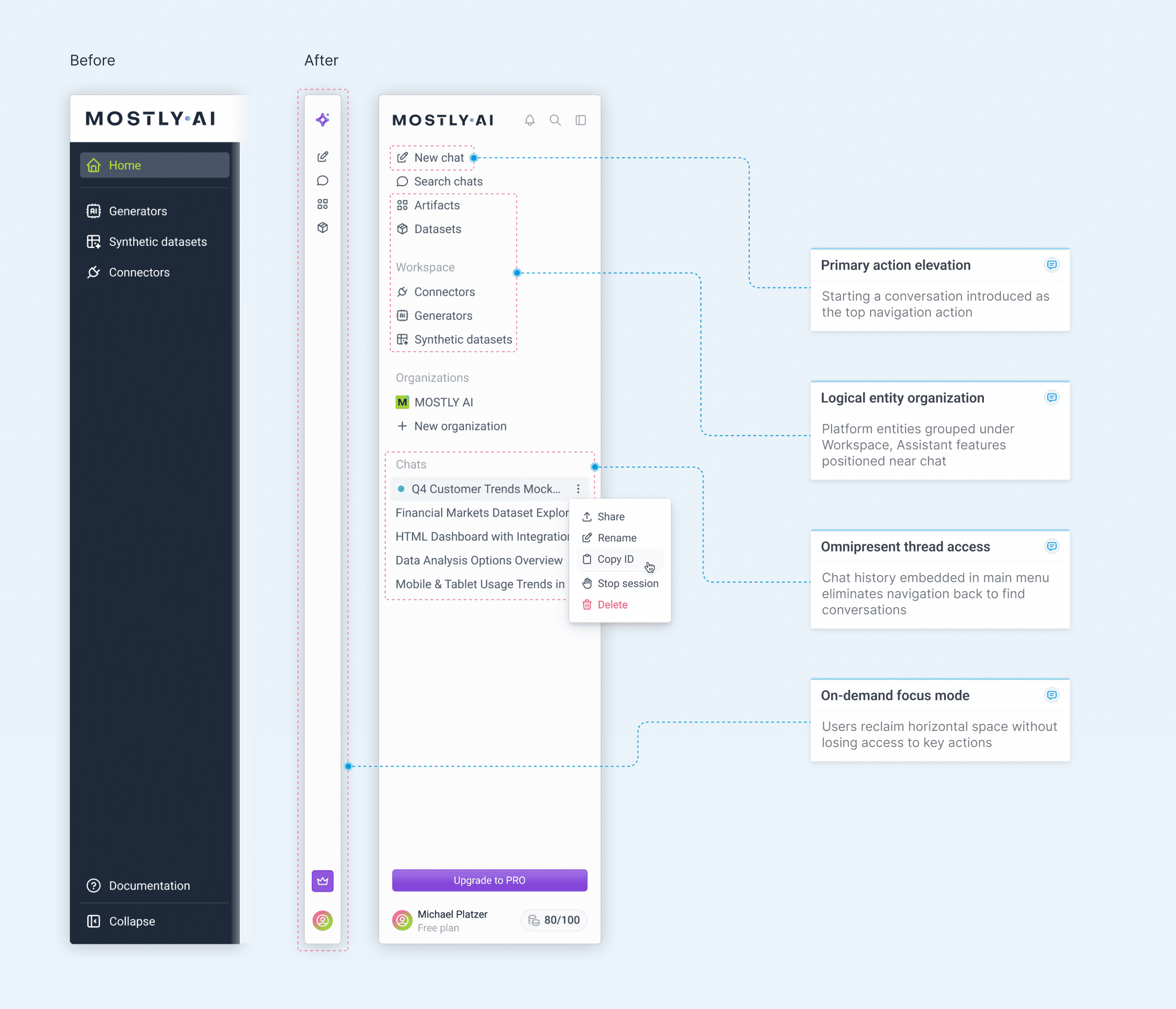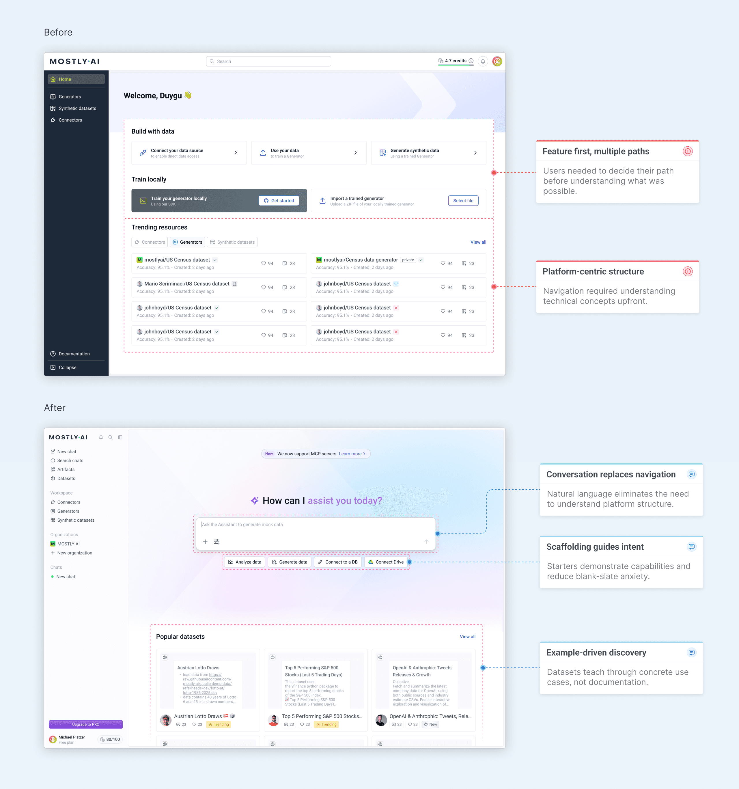 This wasn't just visual cleanup it signaled that conversation had become the primary way to interact with MOSTLY AI.