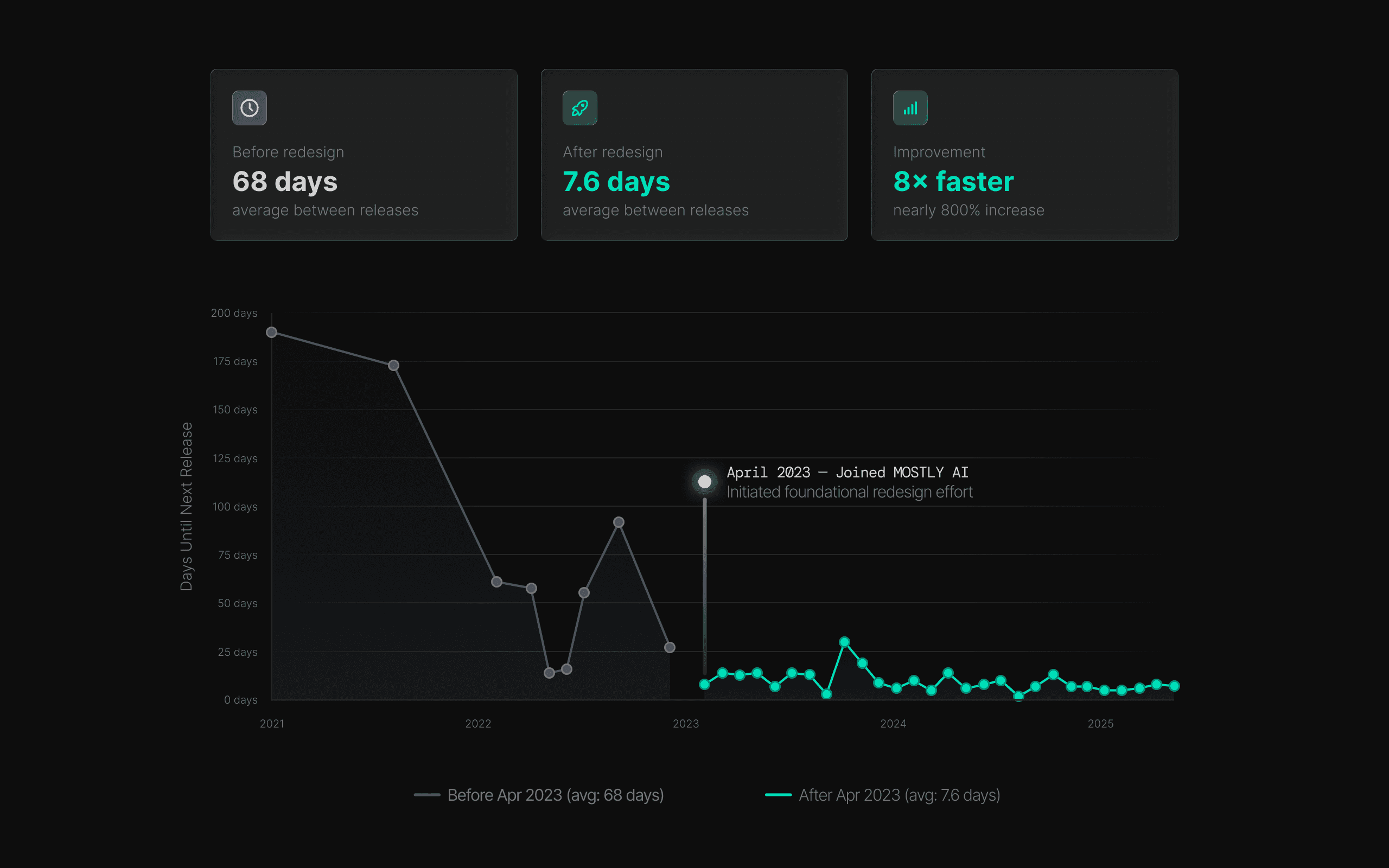 Release cadence increased nearly 8×, from one release every 68 days to one every 7.6, with 30 modular releases shipped over 10 months.