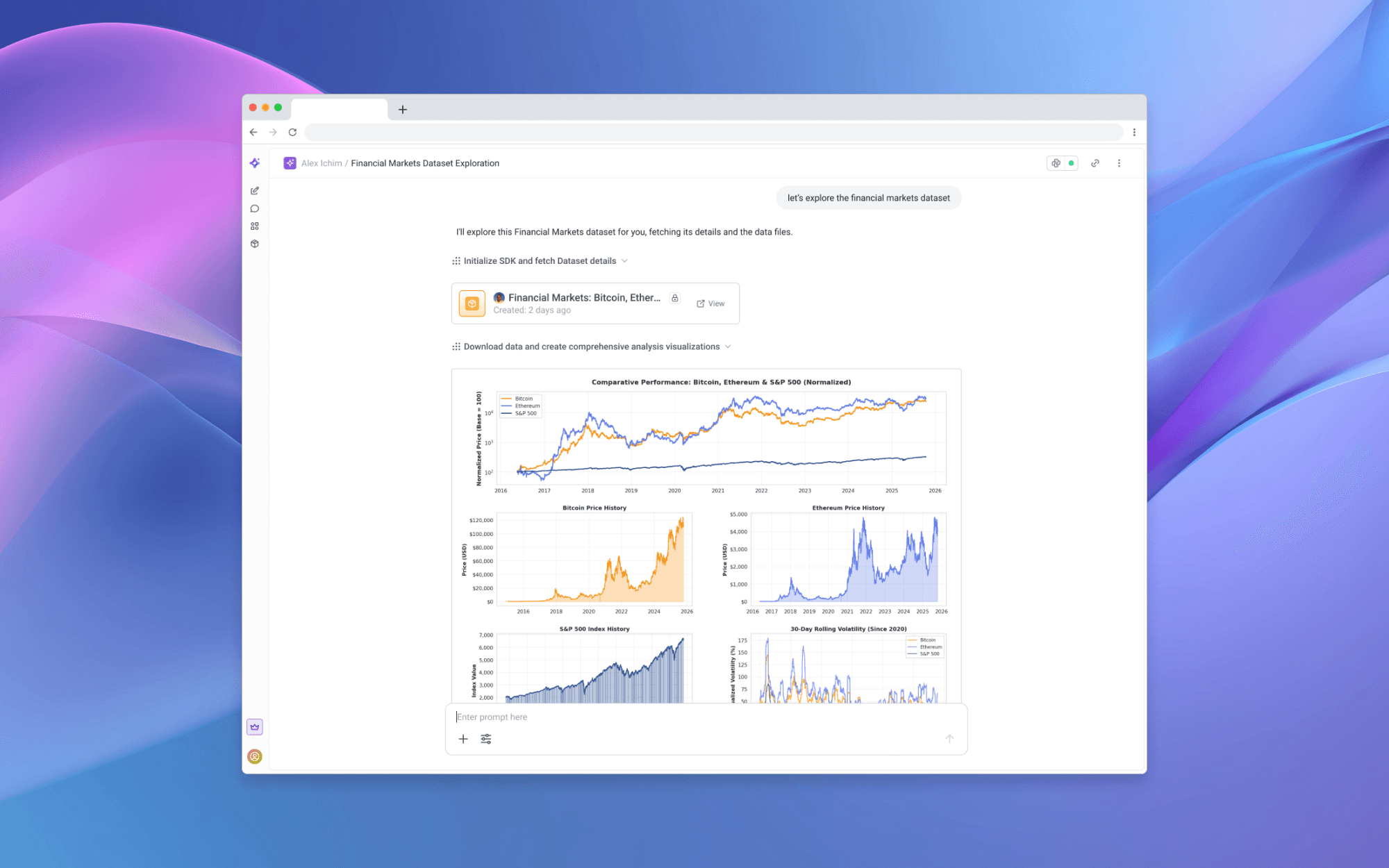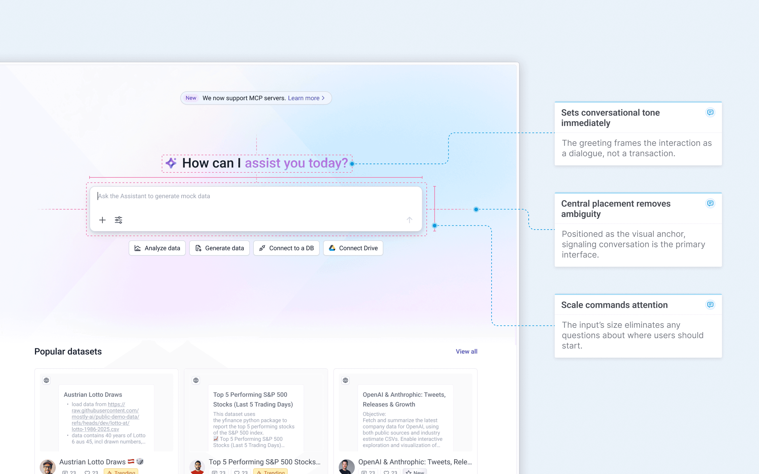 Conversation starters adapt to user behavior. New visitors see core capabilities – analyze data, explore datasets, generate data. Returning users see personalized shortcuts based on their patterns: last used connectors appear first, frequently used integrations become quick actions.