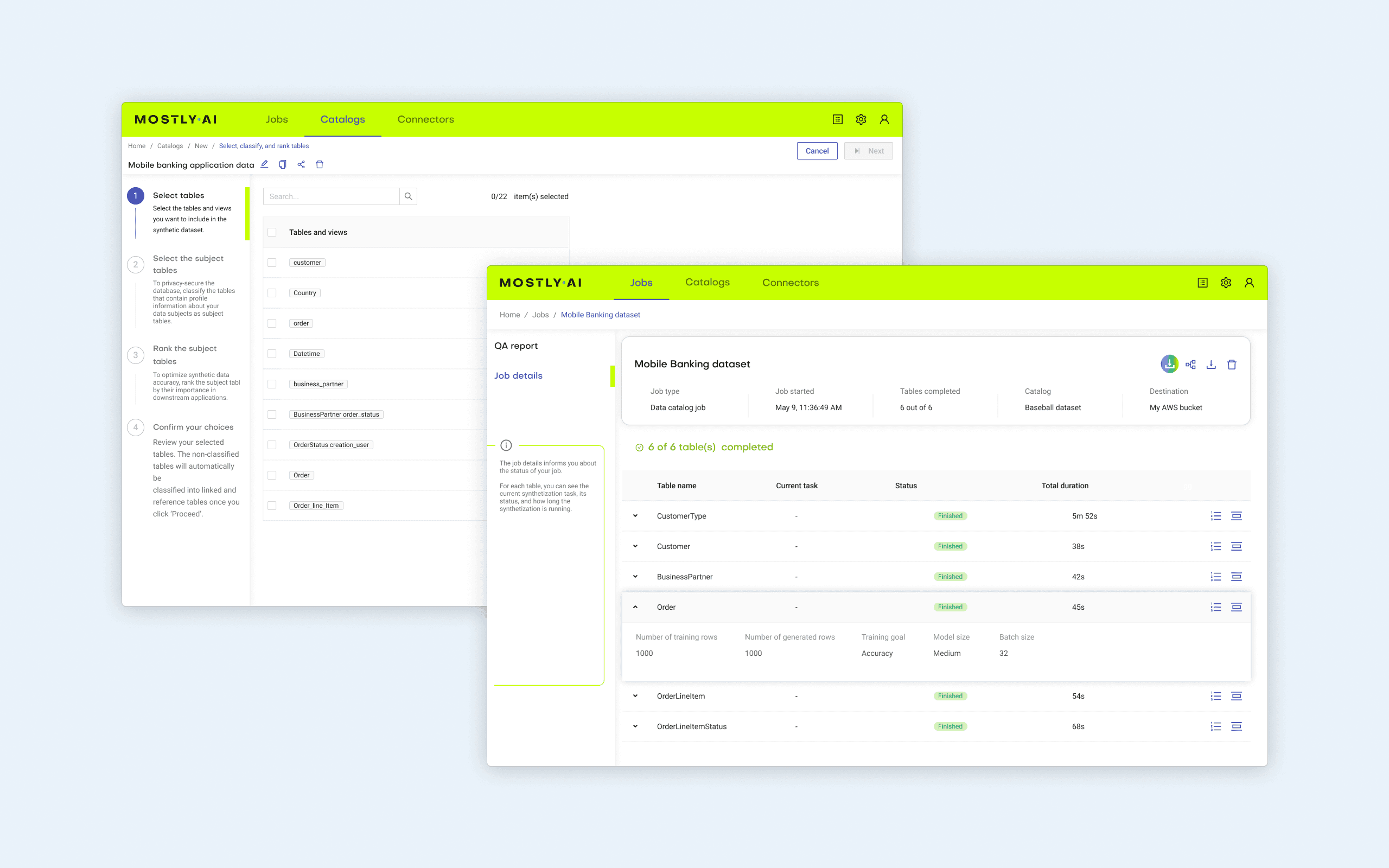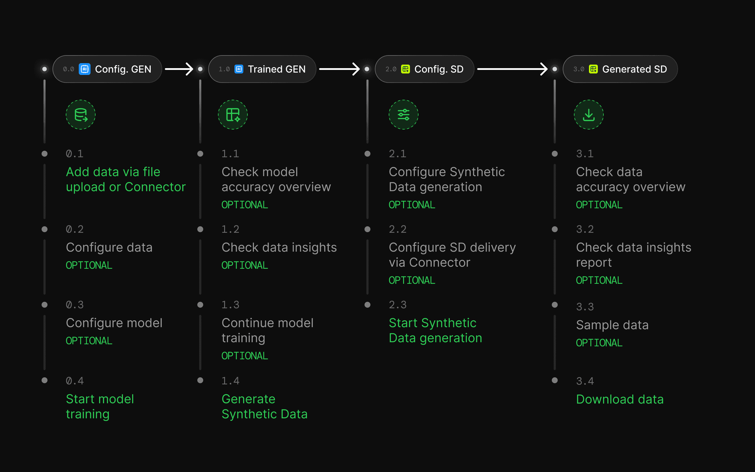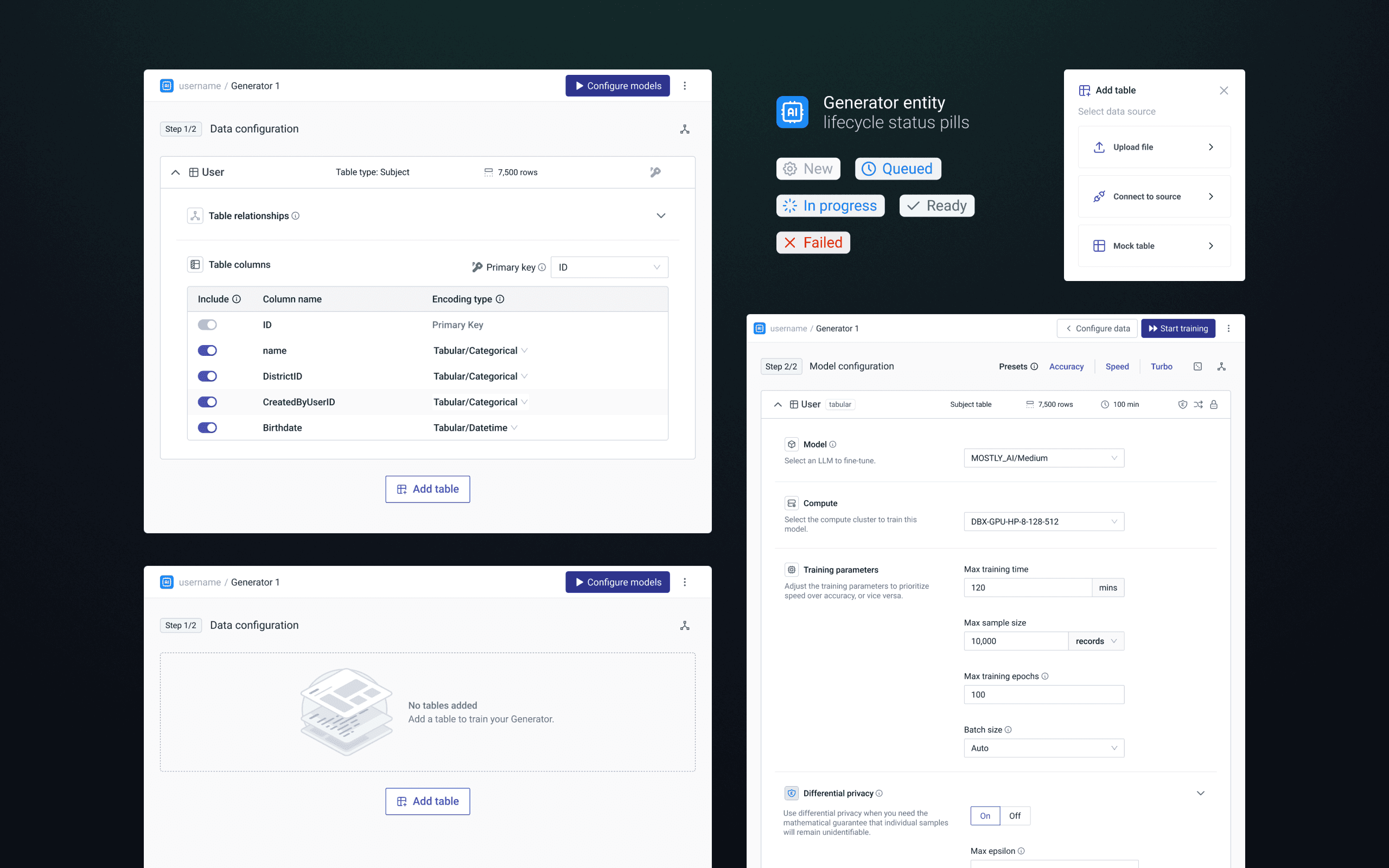 Each Generator and Synthetic Dataset moves through a defined lifecycle – from creation to completion. Status pills visualize this journey with precision, helping users instantly understand where an entity stands and what’s happening behind the scenes.
