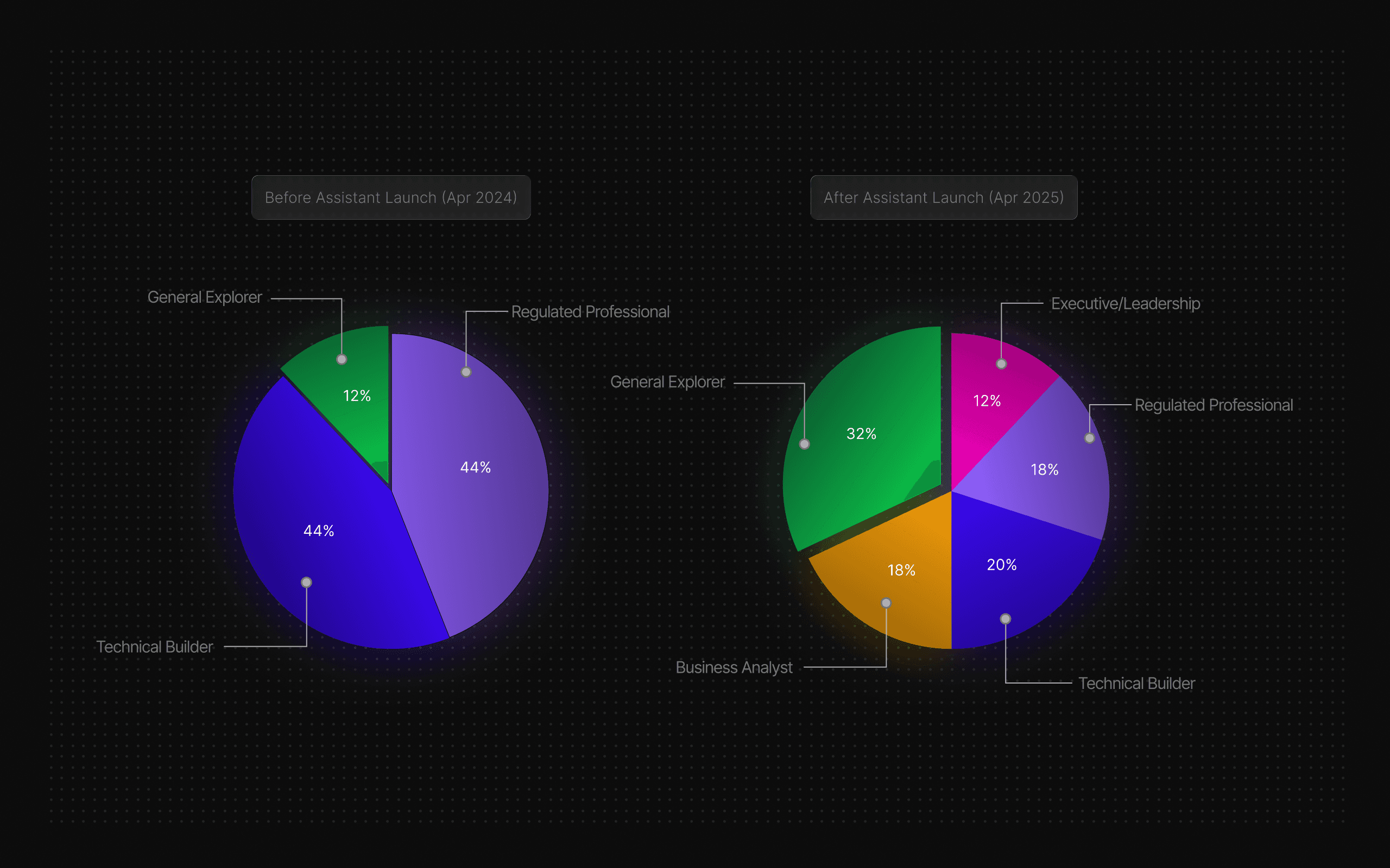 Before the Assistant, technical builders dominated platform usage – 88% of users required specialized skills. One year later, that distribution transformed: general explorers tripled to 32%, business analysts emerged at 18%, and executives gained direct access at 12%.