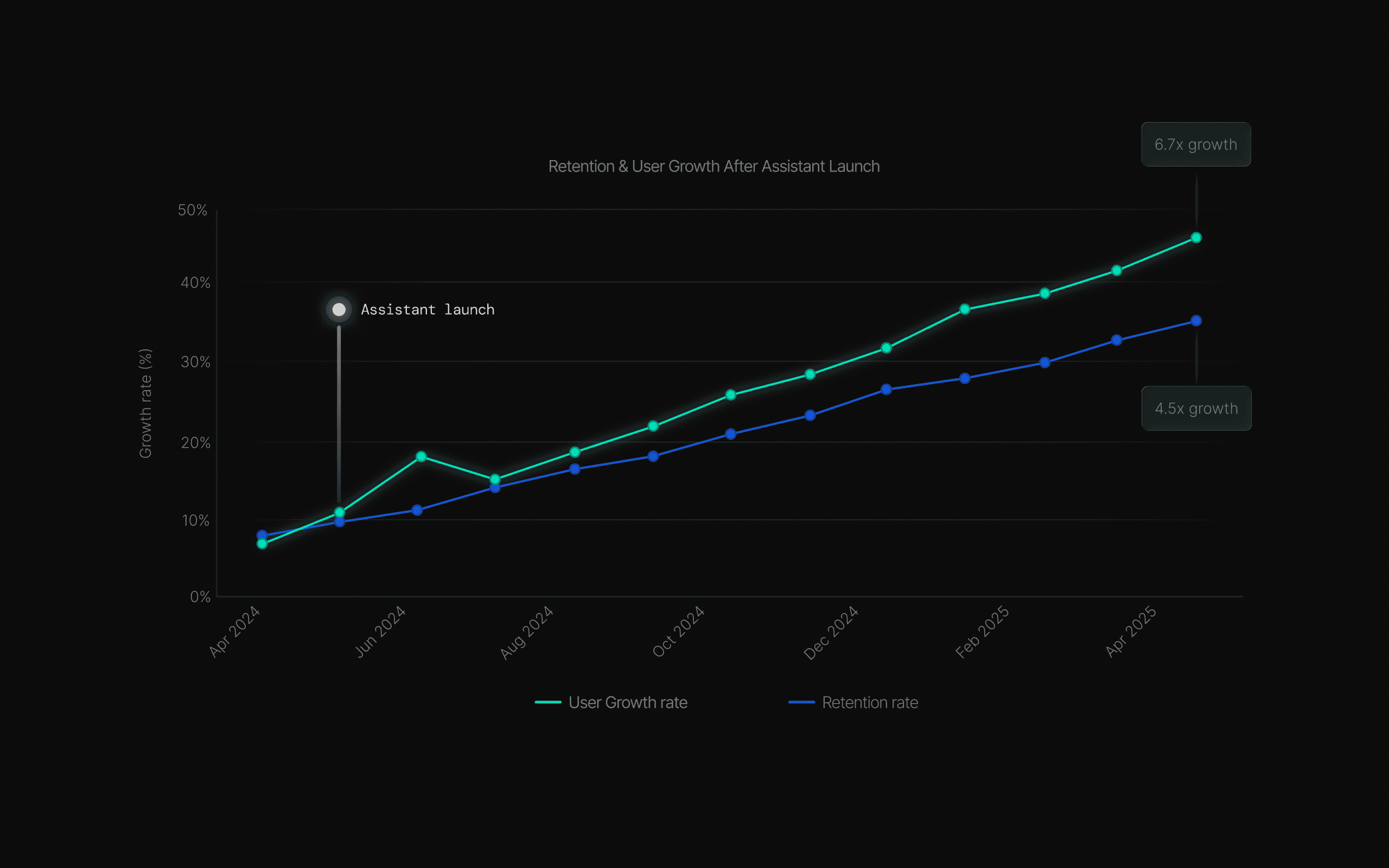 The Assistant didn't just attract new users – it kept them. User growth accelerated 6.7x post-launch while retention climbed 4.5x, proving the conversational interface reduced friction at every stage.