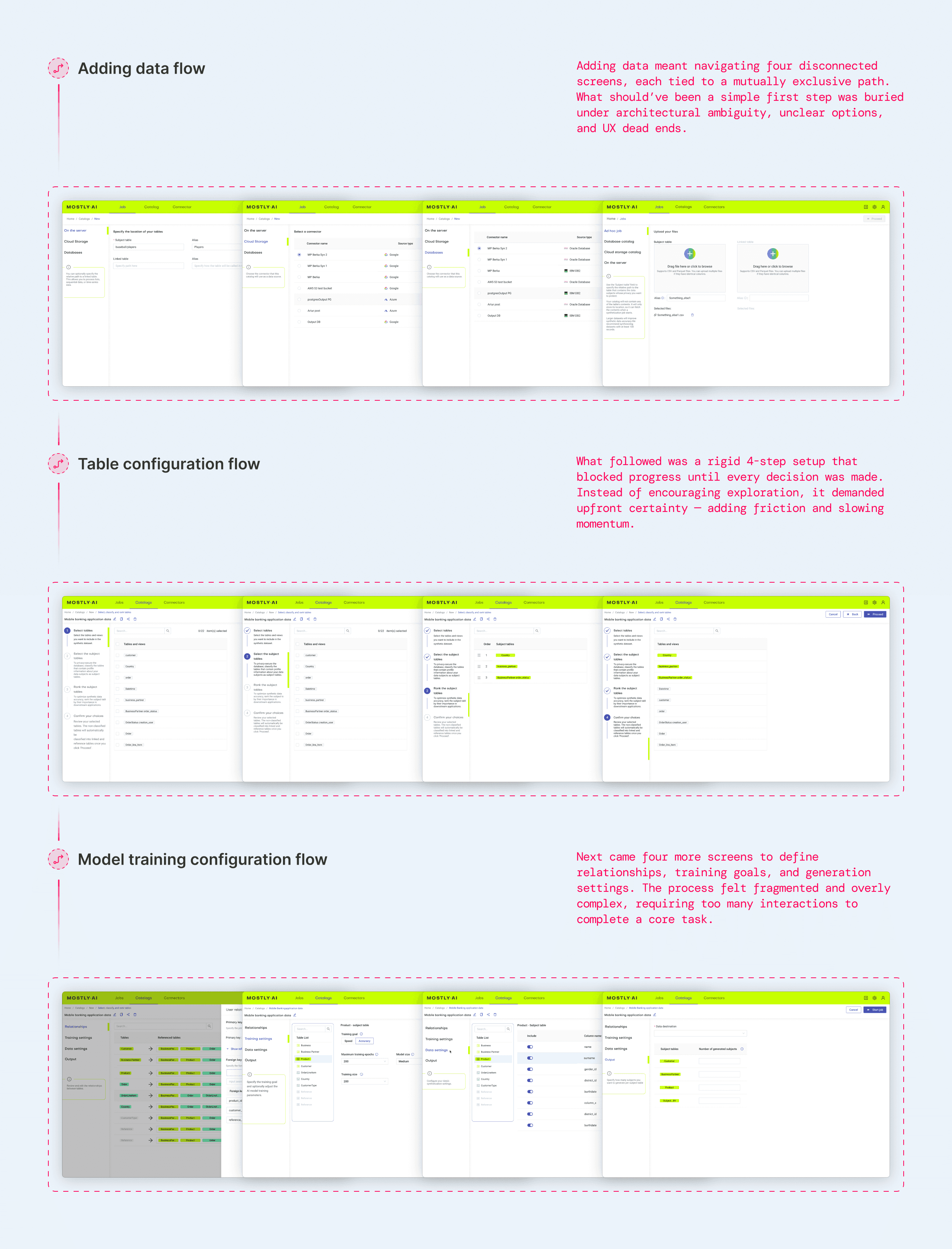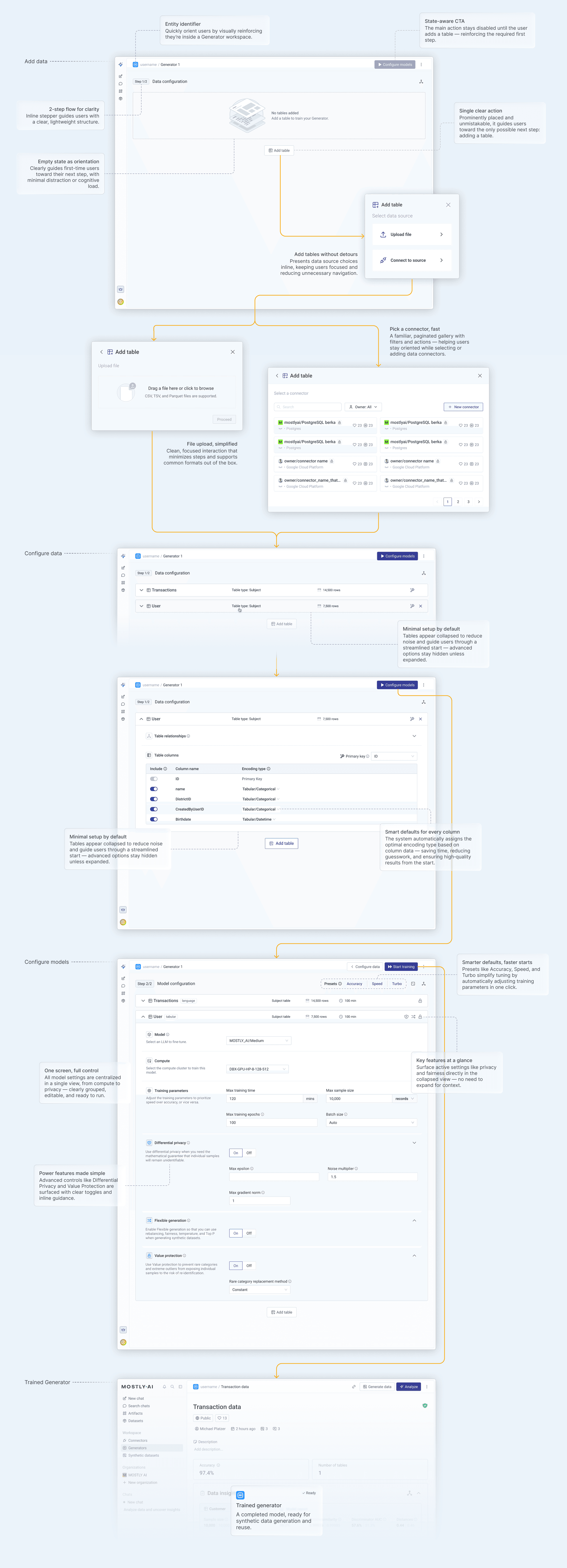 I led the design of the MOSTLY AI Assistant — a conversational AI interface that transforms how users interact with data. Through natural language, users can now analyze data, uncover insights, generate synthetic datasets, and configure generators without touching a single configuration screen.