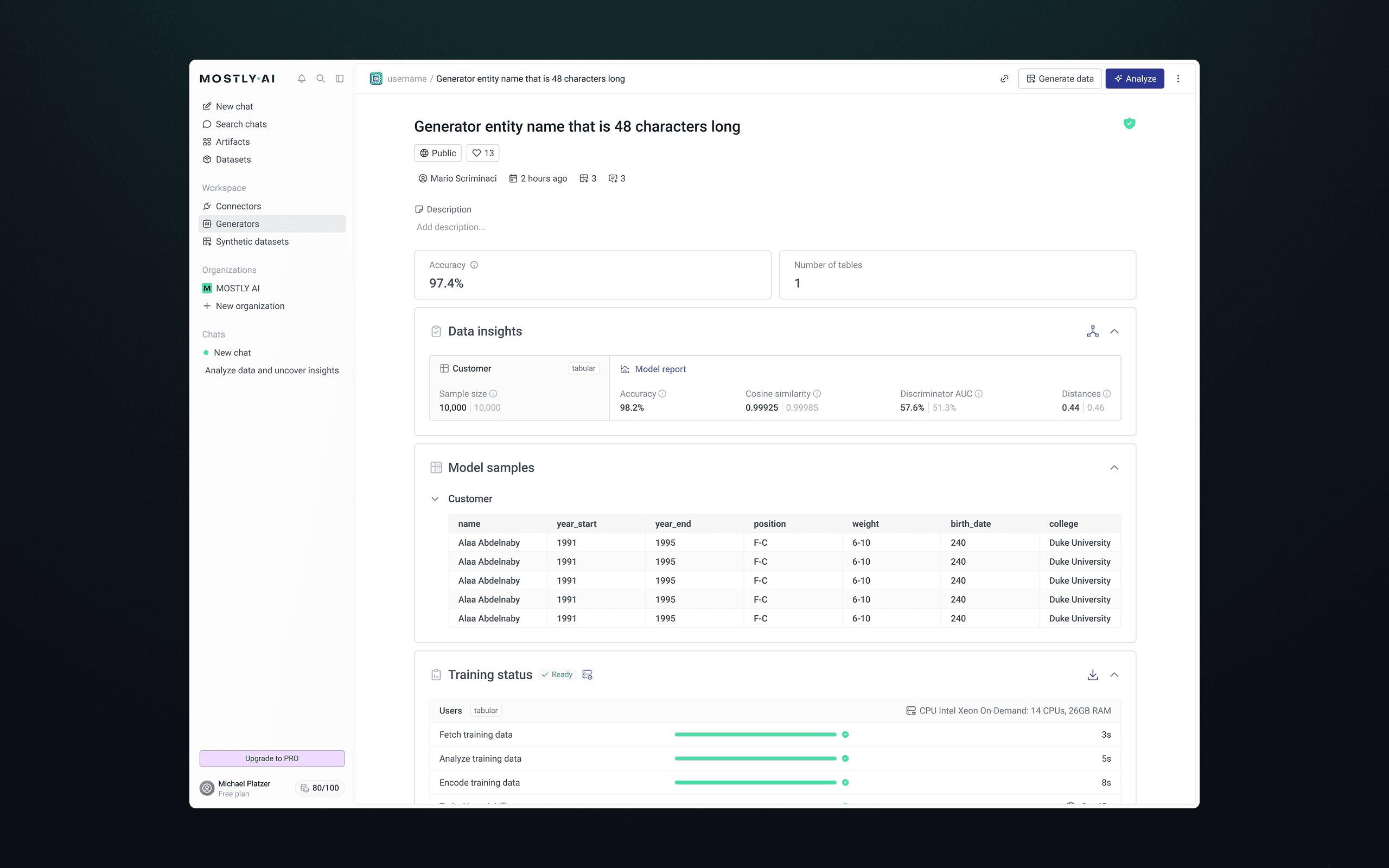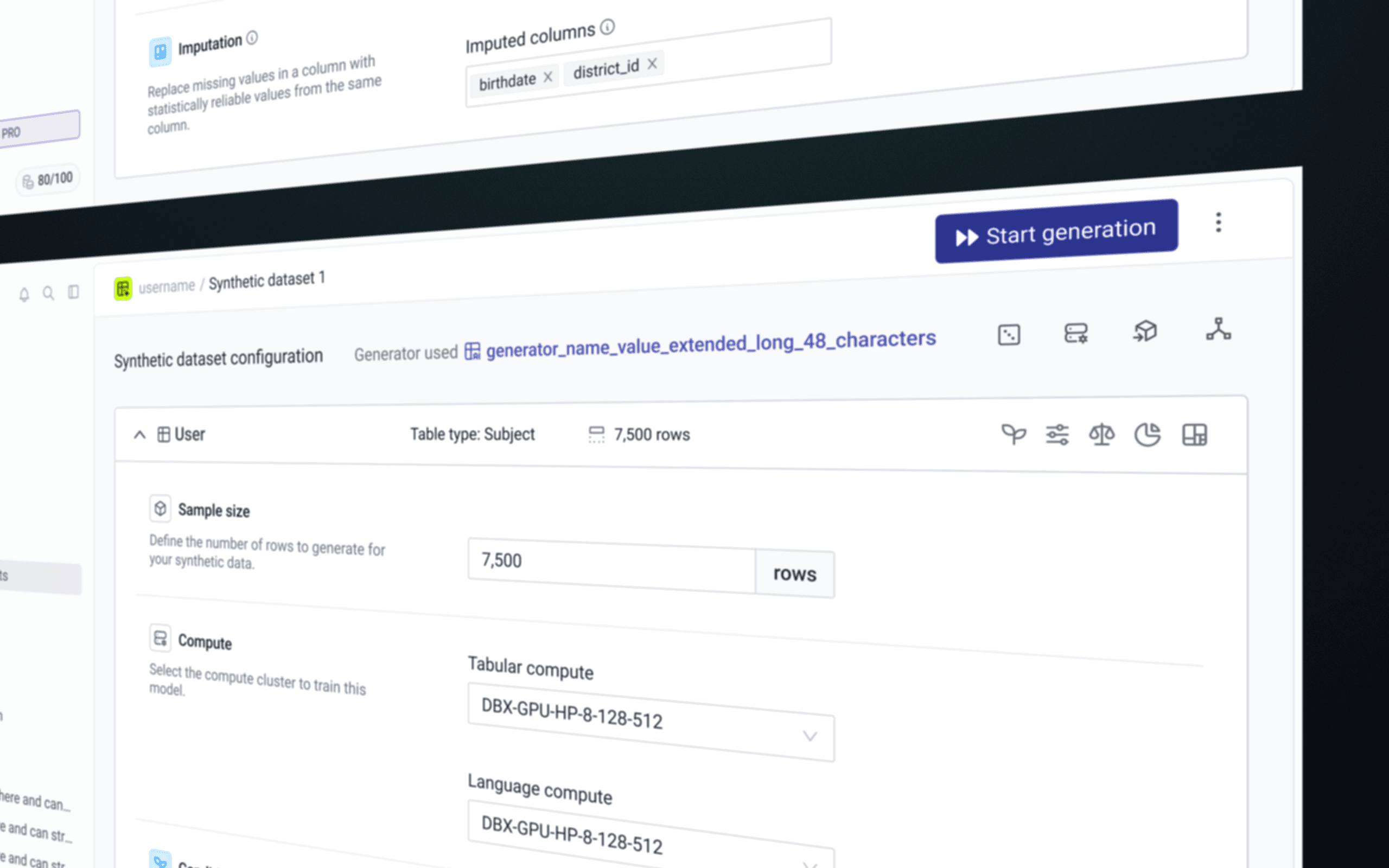 The redesigned Generator overview centralizes everything users need before generating synthetic data. It surfaces key training metrics, accuracy scores, and sample previews, while making configuration and performance data easily accessible.