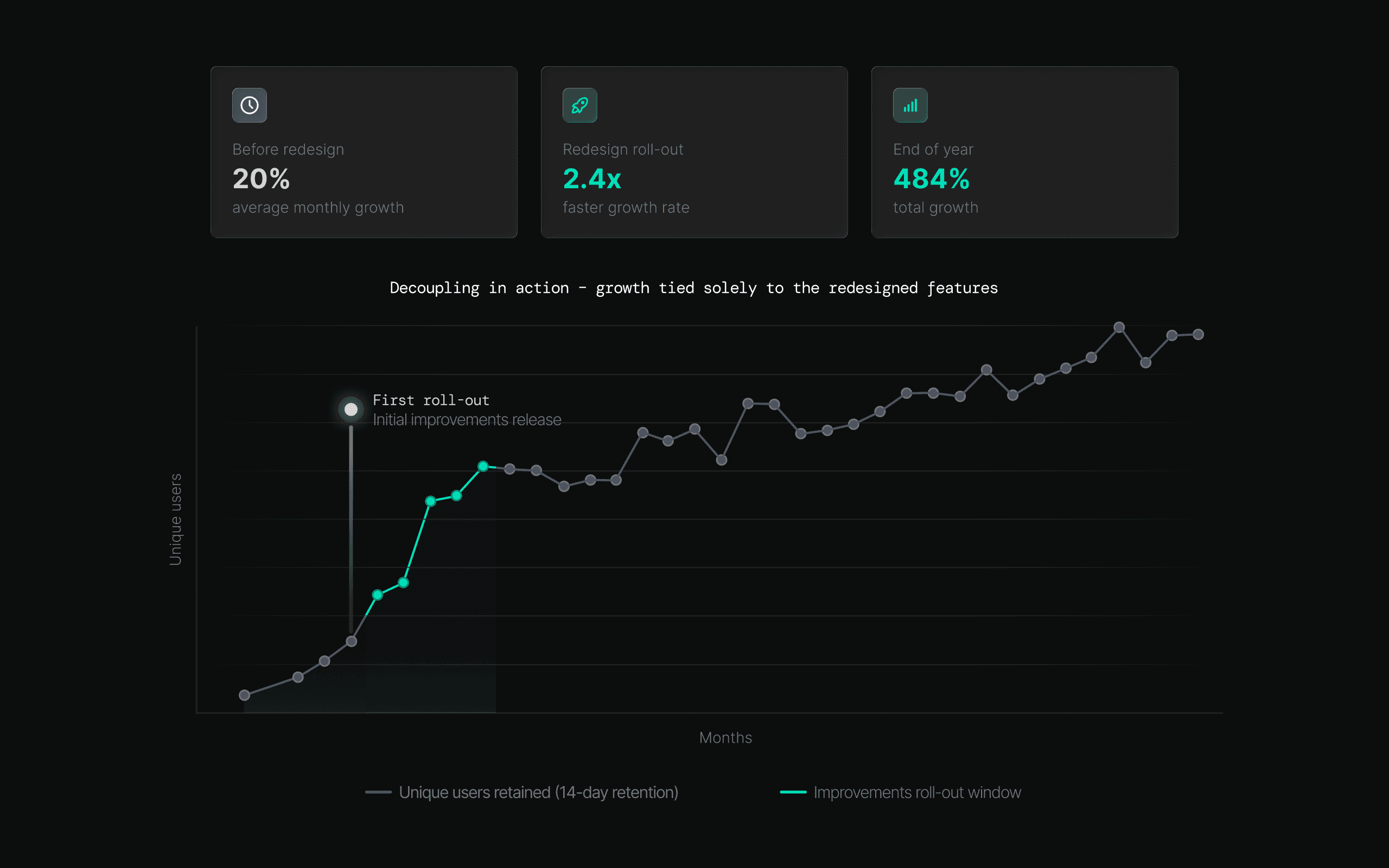 The plot below shows a clear shift. Right after the first improvements rolled out, we saw usage spike – and it kept climbing. Average monthly growth jumped from 20% before the redesign to 2.4× faster during the rollout period. By year-end, this translated into a 484% increase in active users, all within this flow alone.