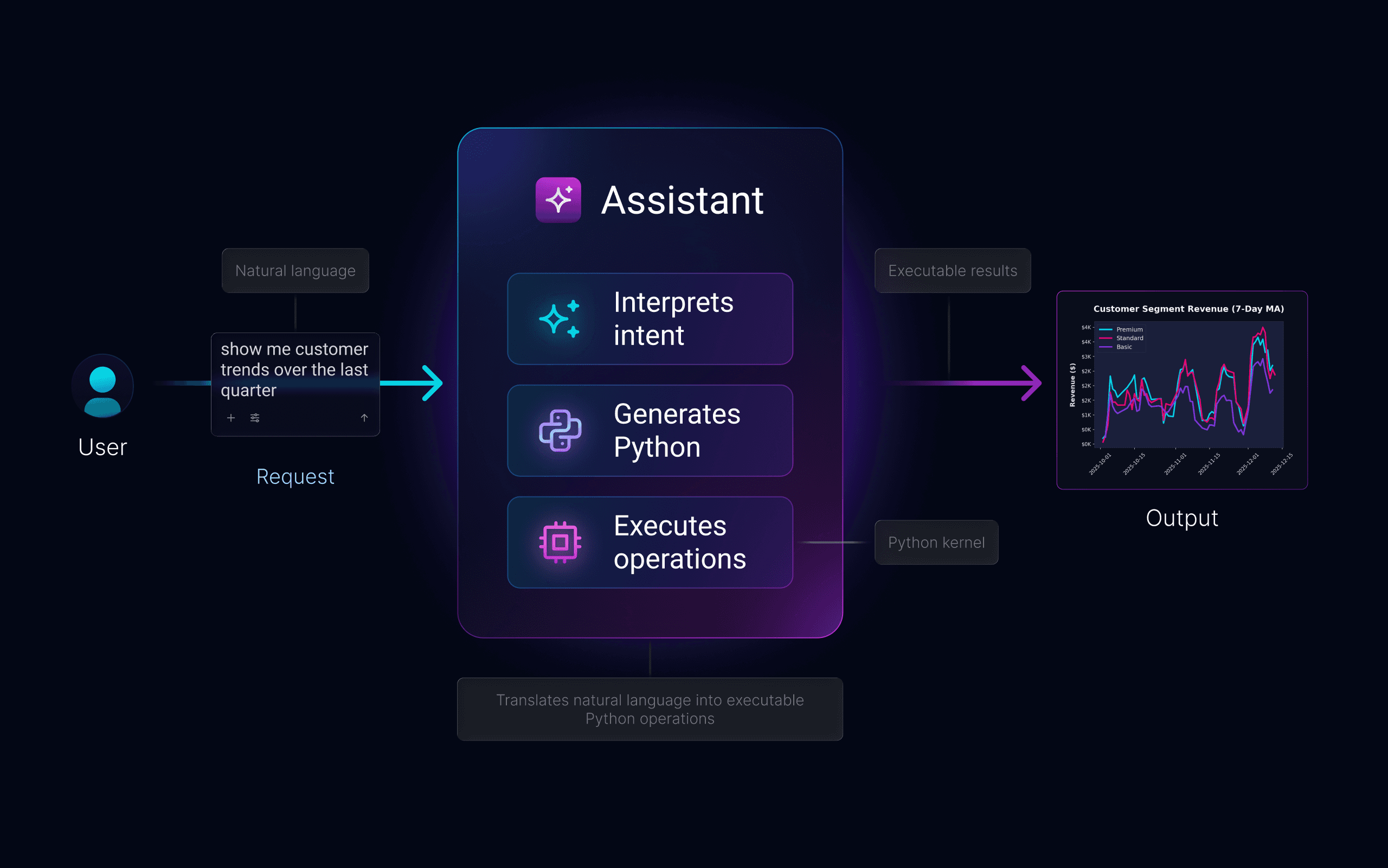 The Assistant doesn't hide its work. Every operation unfolds visibly – planning, code generation, and execution streamed in real-time. Users can expand steps to see actual Python code, understand the reasoning, and verify the approach before results appear. This transparency builds trust.