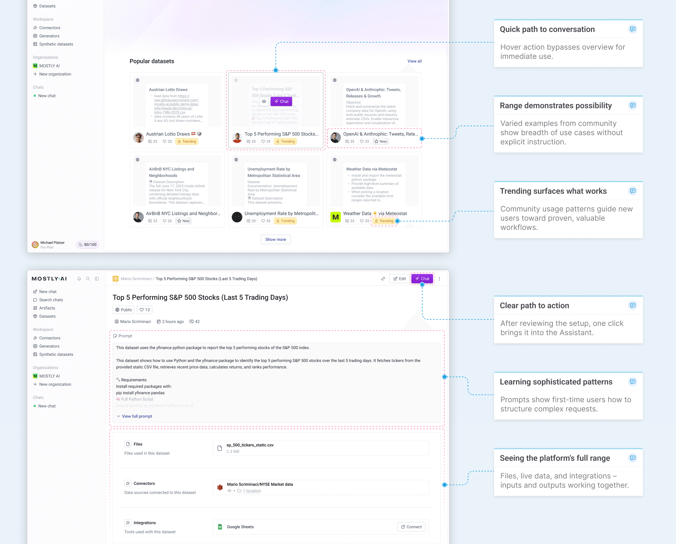 We introduced Datasets to solve the blank-slate problem for complex workflows. Users struggled to articulate sophisticated requests combining connectors, files, and integrations. Datasets became reusable templates—pre-written prompts with connected entities—demonstrating possibilities while lowering barriers to advanced use cases.