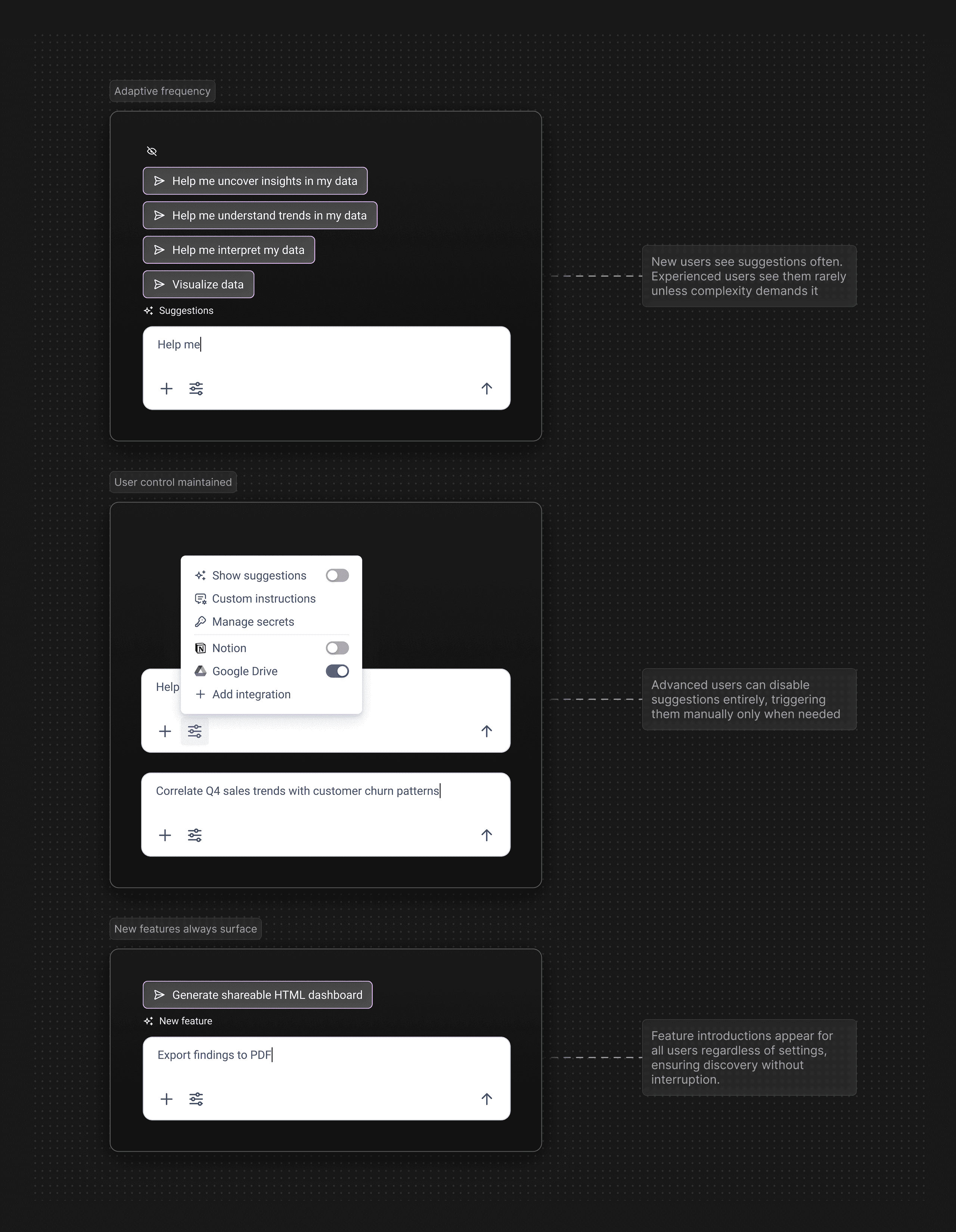 Beginners see suggestions frequently while the system learns their patterns. Advanced users can disable them entirely, but complexity always triggers guidance – and new features surface for everyone, ensuring discovery without depending on settings.