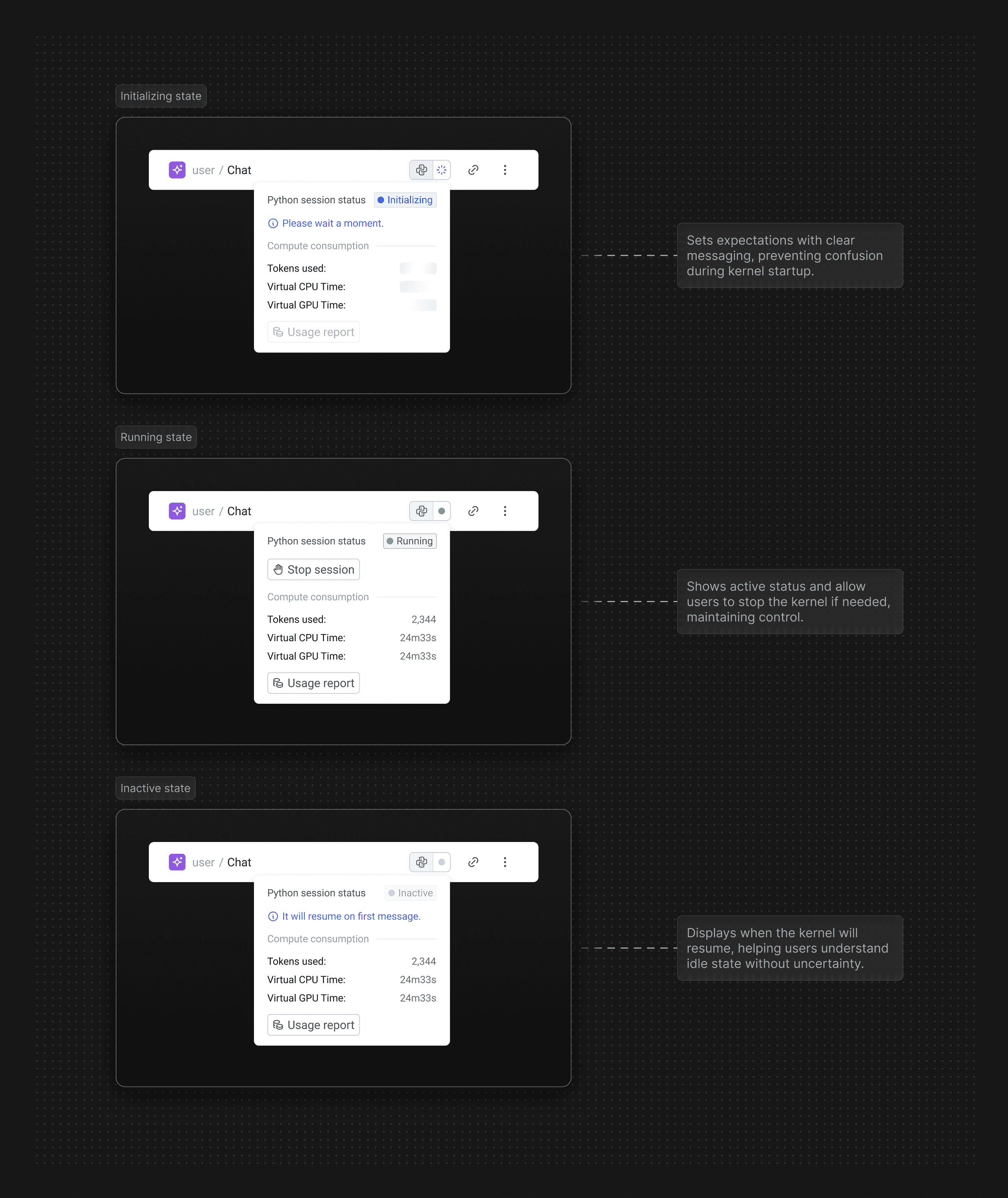 Each chat spins up its own Python kernel. When users start a new conversation, the kernel initializes; it stays running throughout the active session. Returning to an idle chat requires restarting the kernel.