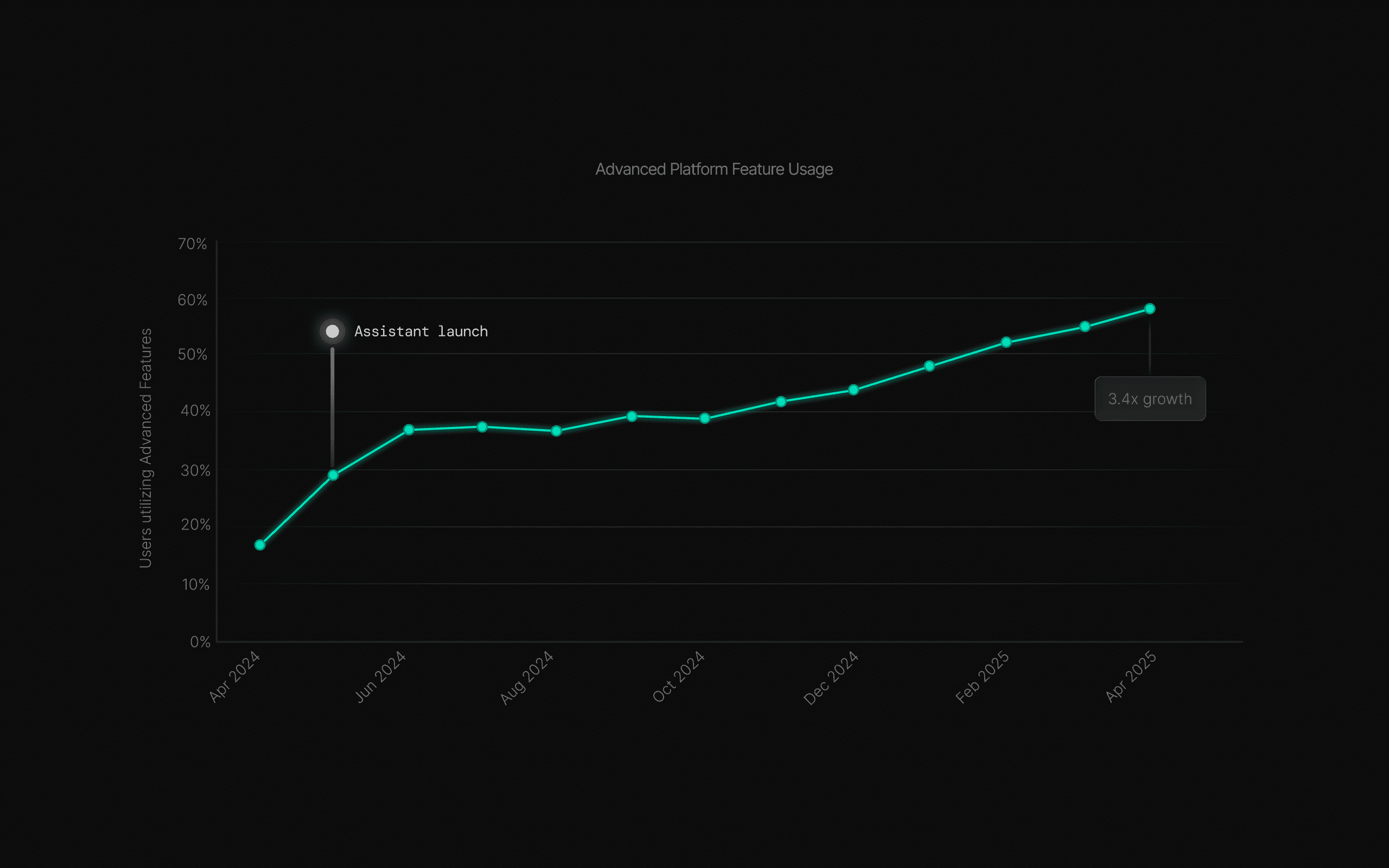 Advanced features that once intimidated users became approachable with the Assistant's guidance. Usage of complex capabilities jumped from 17% to 58%, a 3.4x increase.