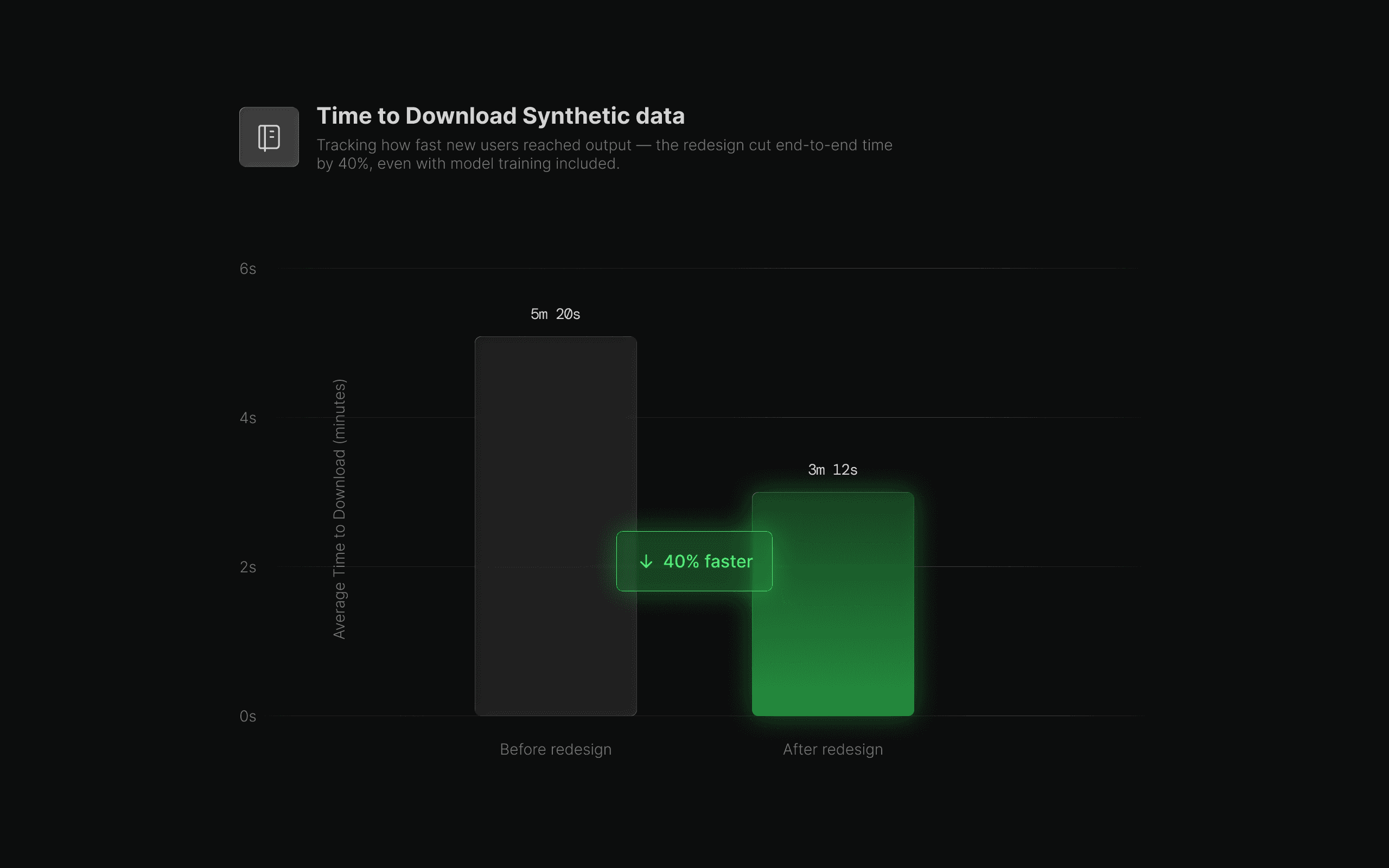 Redesigning the experience dramatically reduced the time it took new users to generate and download their first synthetic dataset — from over 5 minutes to just above 3. This 40% improvement reflects a more intuitive flow, fewer barriers, and a quicker path to meaningful outcomes.