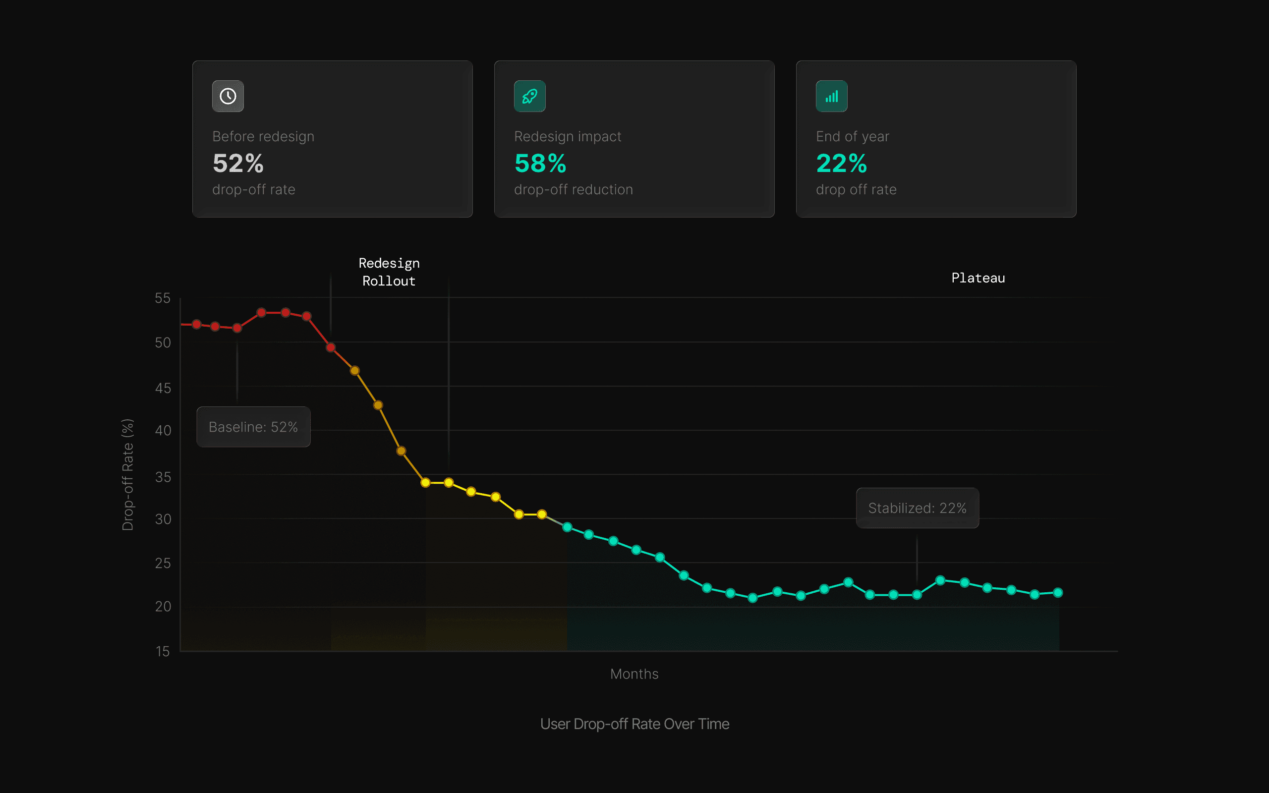 The result? A steady drop in attrition, eventually stabilizing at just 22% – a 58% reduction. The changes didn’t just look better – they helped more users stick with the journey until the end.