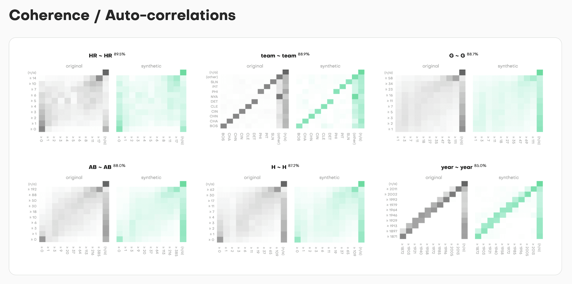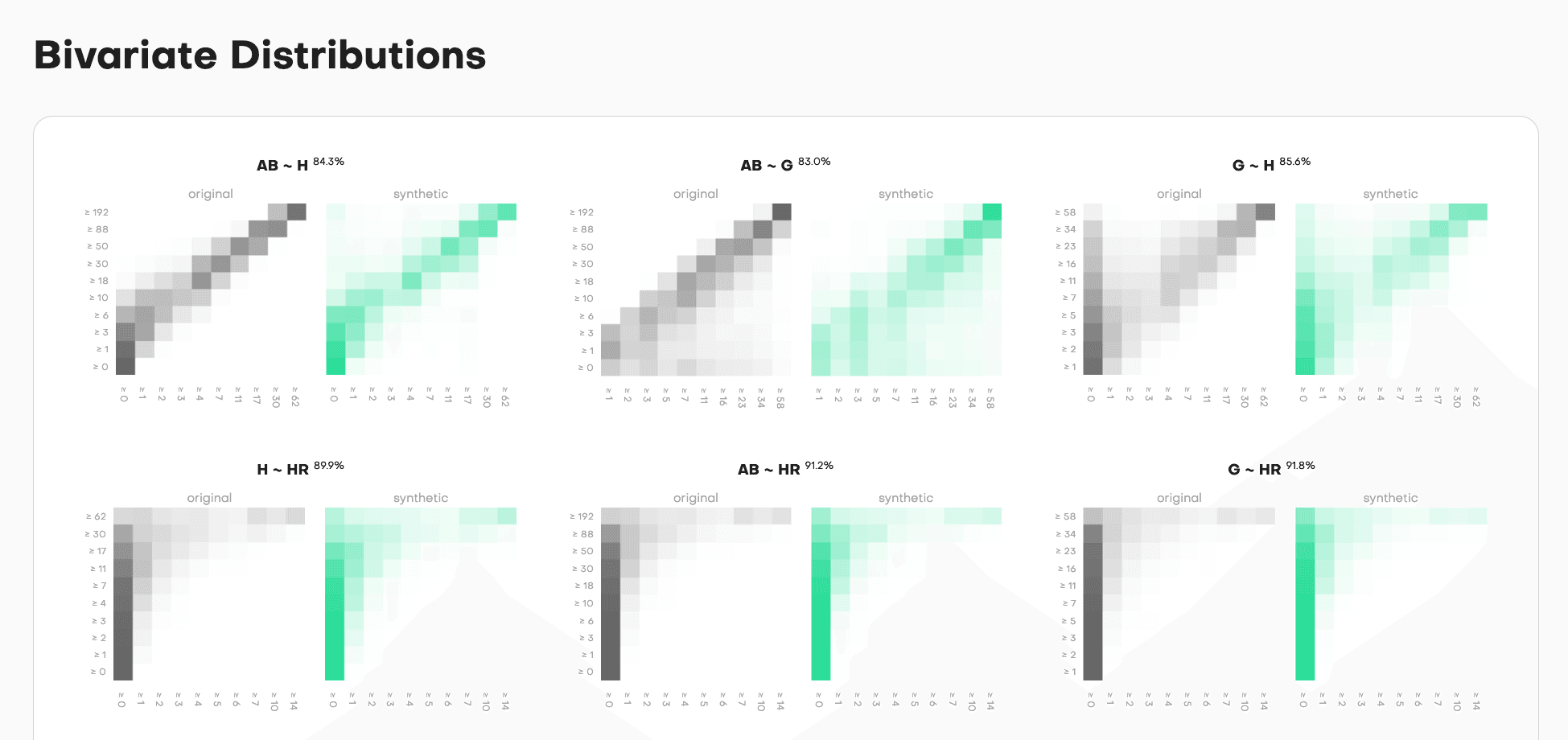 The intensity shows frequency. Darker cells mean more samples fall in that value combination. The accuracy percentage tells you match quality, but the heatmap shows you where the synthetic data succeeds or fails.