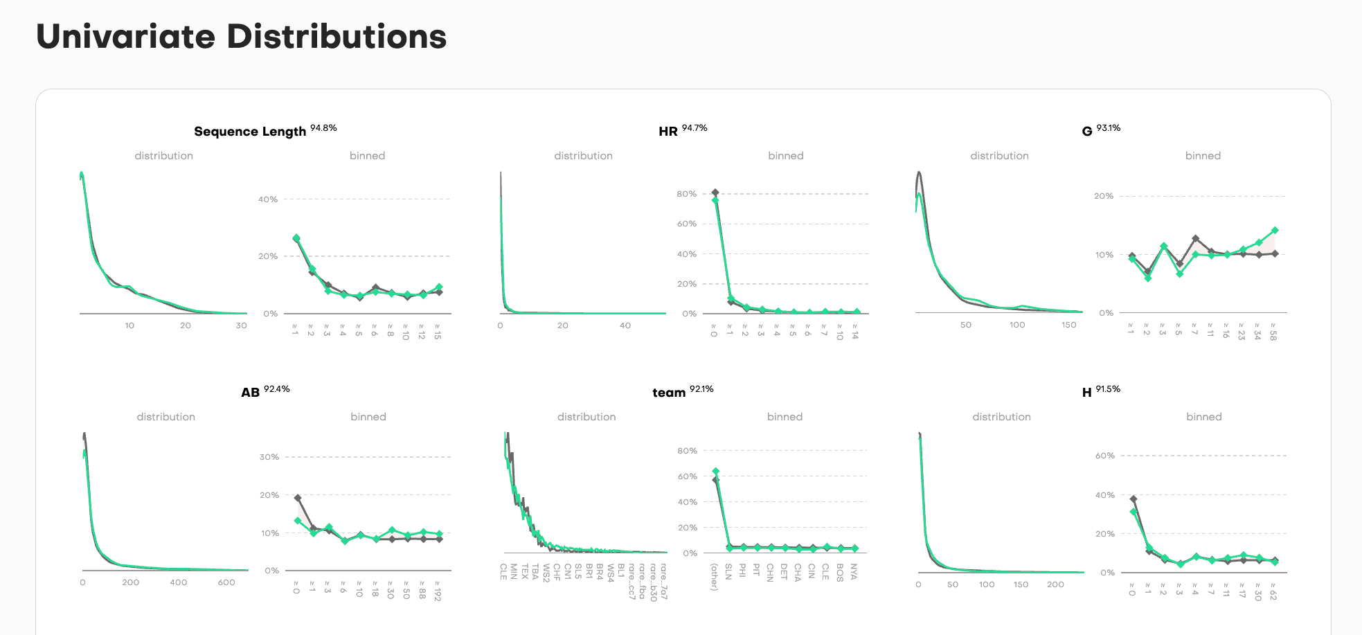 The accuracy percentage sits at the top, but the real diagnostic power is in the curves themselves. A user can scan six columns in seconds and see: "Sequence Length and HR distributions nearly perfect (94.8%, 94.7%), team column shows exact categorical match (92.1%), but look at column G. It has some noise in the middle range despite 93.1% overall accuracy."
