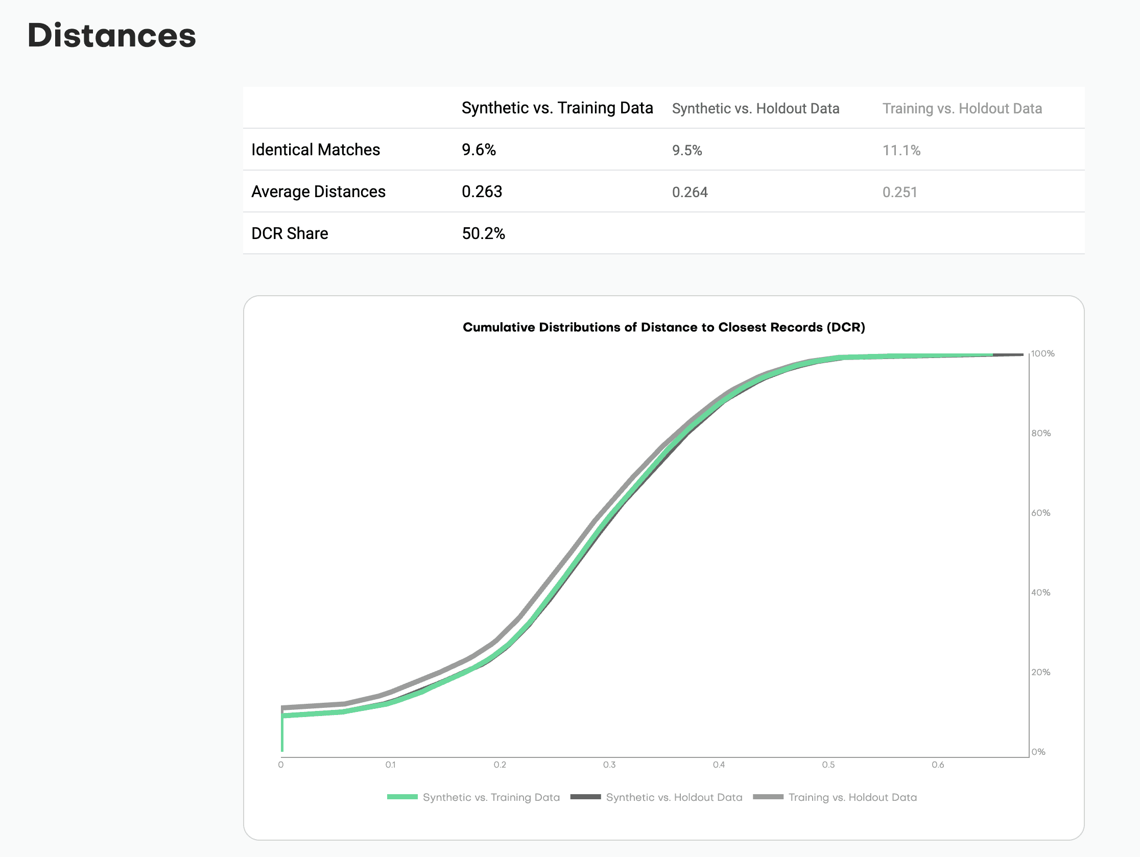 The solution: Show the cumulative distribution of distances so users can see exactly how close synthetic samples are to training data.