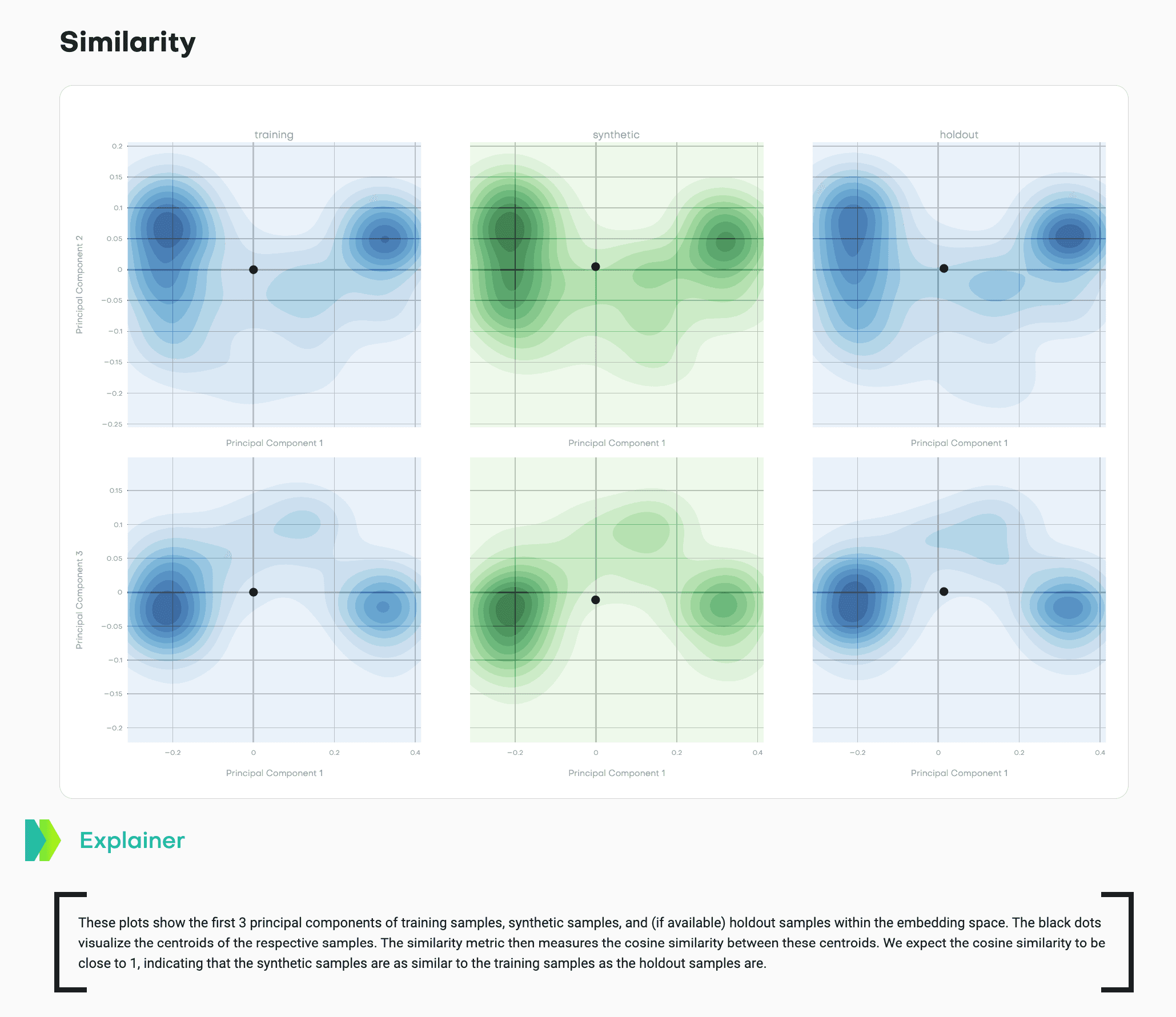 What good synthetic data looks like: The teal contours match the shape and spread of the blue contours. The synthetic centroid sits in a similar position relative to its cluster as the holdout centroid does to its cluster. The cosine similarity between training and synthetic centroids should be close to 1, matching the training-holdout similarity.